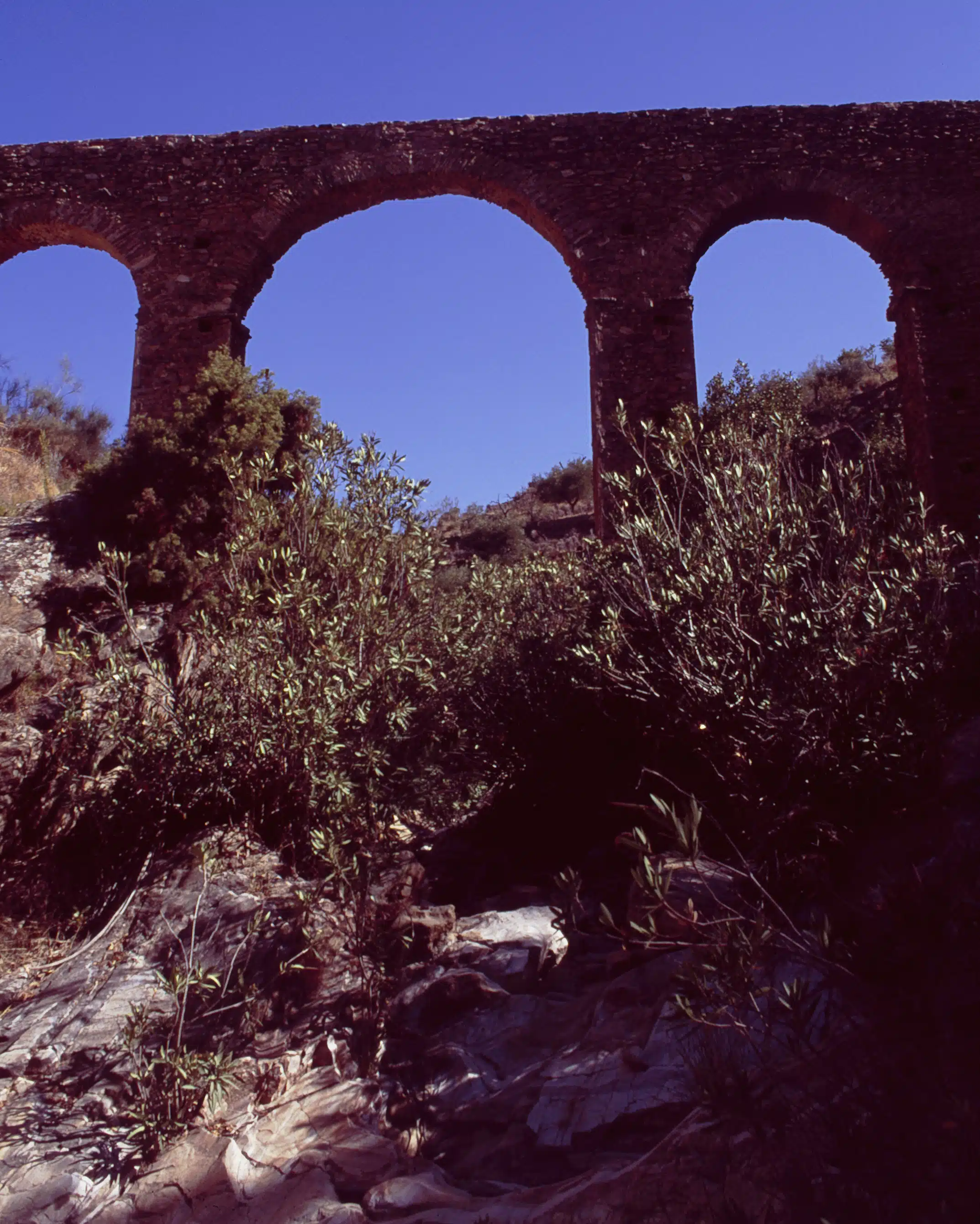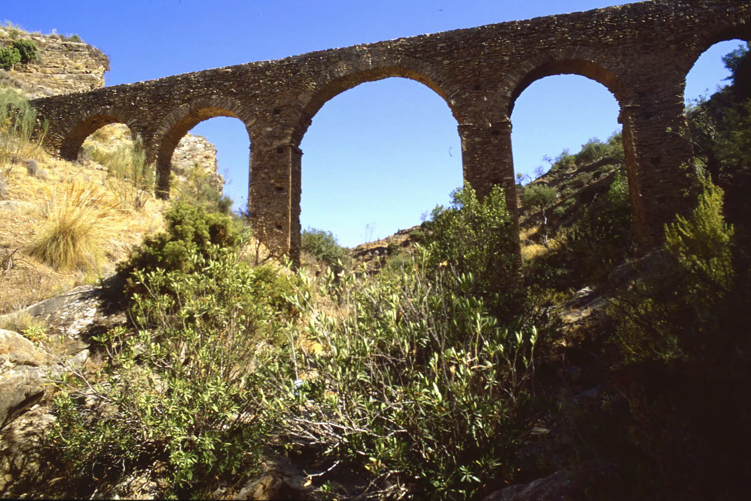 El arco central de siete metros de altura salva un cauce seco y sostiene esta solitaria obra de ingeniería romana. En el tranquilo pueblo de Albánchez la llaman Los Arcos de la Rambla del Pozo y se usó para regadío hasta comienzos del siglo pasado, lo que demuestra que los romanos sabían construir obras muy duraderas. Otra prueba de su presencia en la zona es el hallazgo del relieve de un fauno echando agua por la boca, que está en el Museo de Almería.