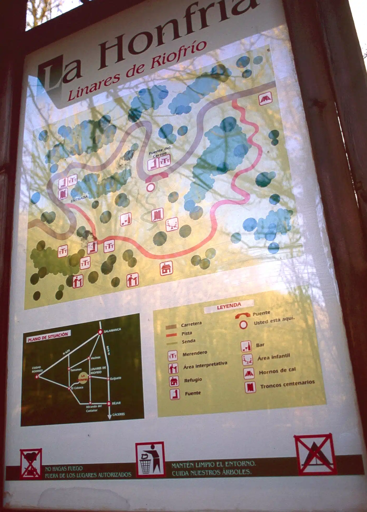 Desde el pueblo de Linares de Riofrío parte una pista que bordea el río y alcanza el bosque de la Honfría. Tras pasar el área recreativa, un recorrido por esta mata tupida y silenciosa permite ver troncos de árboles centenarios, entre los que destacan los castaños y los acebos. En el paraje de la Honfría hay un una fuente y un viejo refugio, casi en desuso, y algunas pistas como las que conducen al pico Cervero, a más de 1400 metros de altitud, y a El Hueco, que ofrece estupendas panorámicas del valle de Las Quilamas.