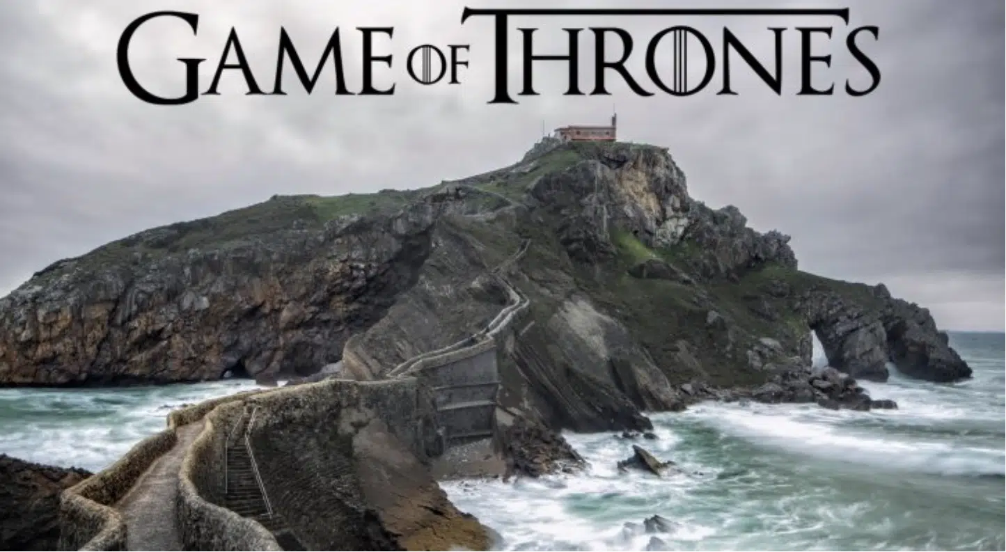 Además de su emplazamiento en un soberbio roquedal que se adentra en el mar, San Juan de Gaztelugatxe ha servido de escenario de algunos momentos en la popular serie televisiva “Juego de Tronos”. El trabajo de animación y la ayuda de los ordenadores hicieron posible que se convirtiera en el mítico Rocadragón en una de las temporadas de la serie. Cualquiera que haya visto los episodios correspondientes (en la séptima entrega) podrá imaginarse la modesta ermita convertida en una monumental fortaleza rodeada por el vuelo de los dragones.