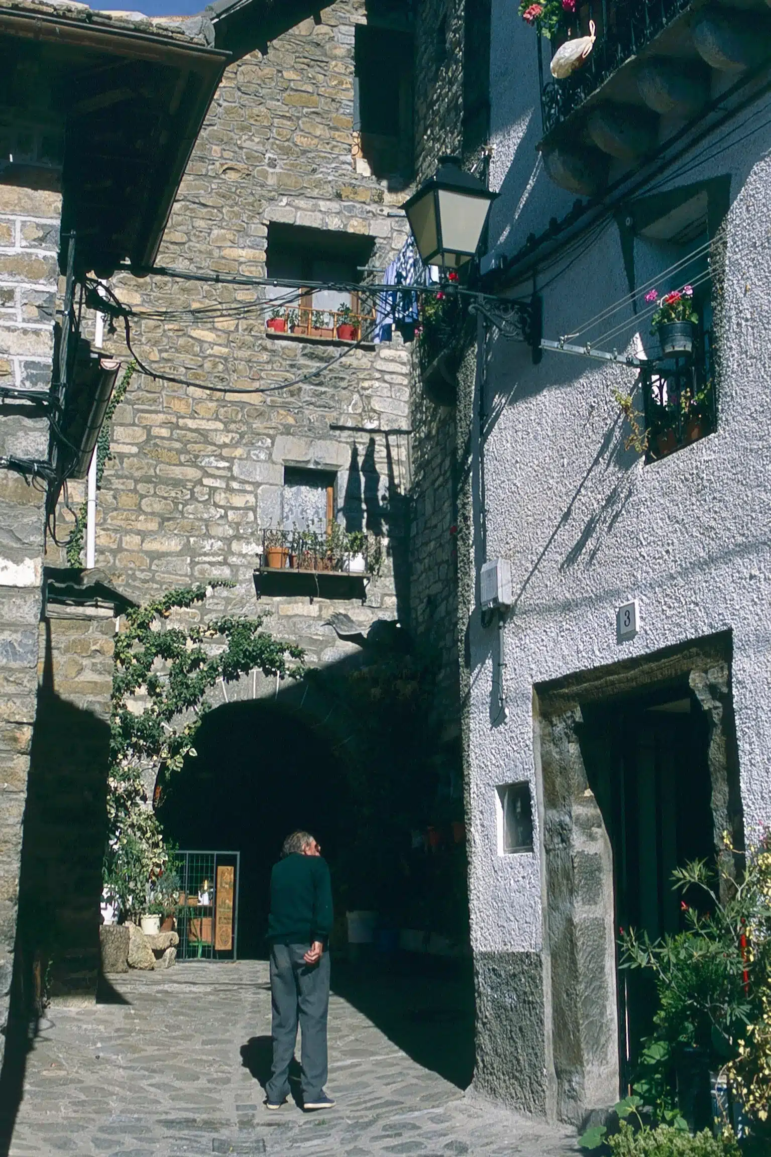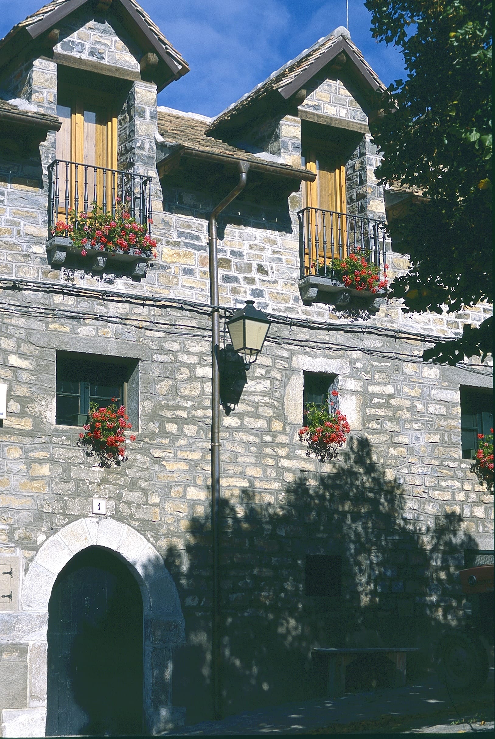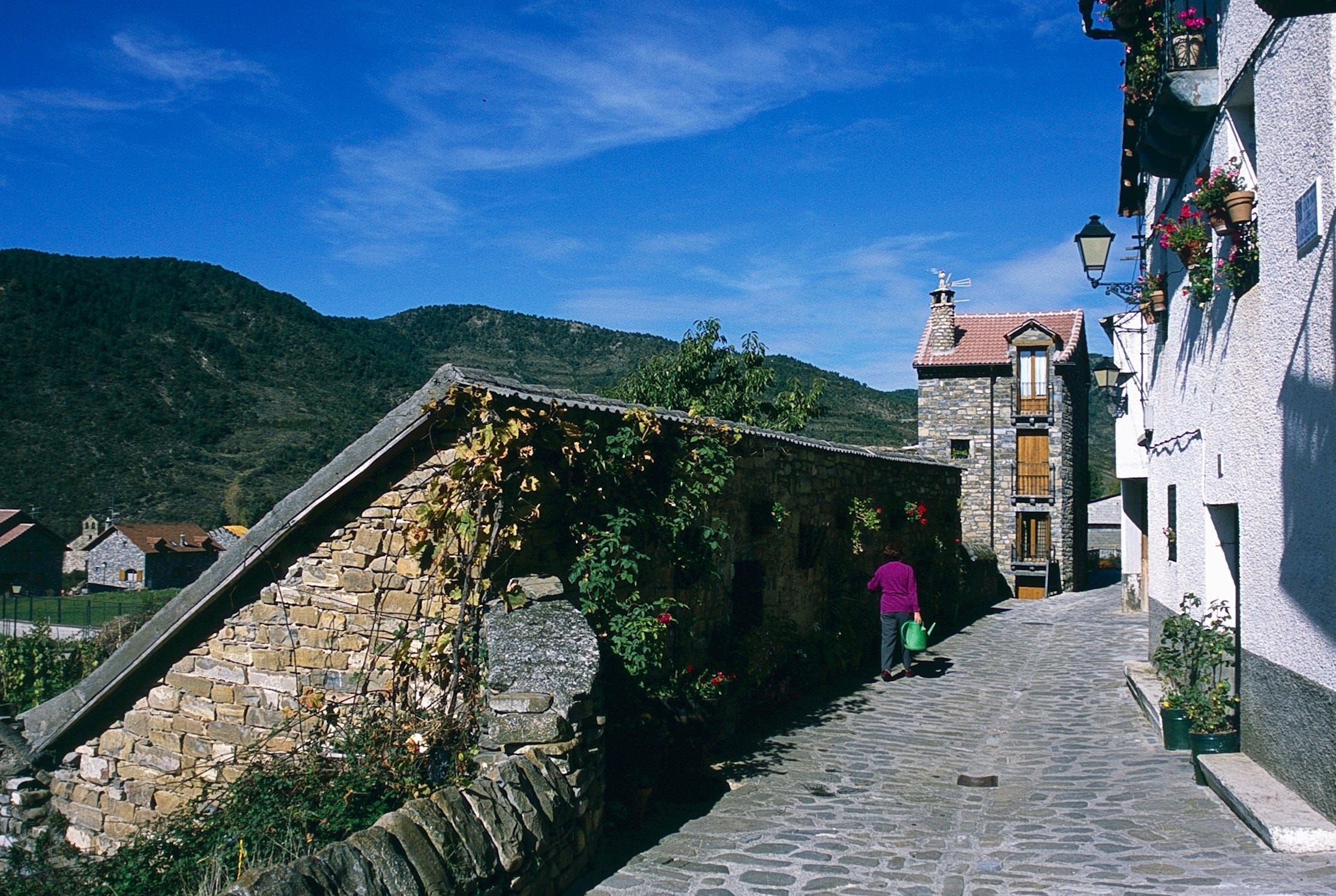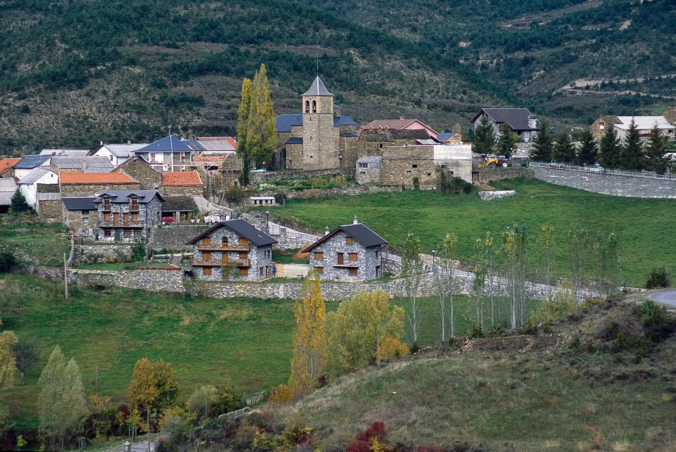 Su bonito casco urbano, en el que predomina el uso de la piedra granítica, se extiende al pie de un monte y cuenta con algunas callejas animadas por el colorido de las flores. Algunos escudos blasonados, chimeneas “espantabrujas” y callejones con arcos contribuyen a la fisonomía pintoresca del pueblo, en el que destaca la iglesia de San Pedro Apóstol, cuyo nombre denota la proximidad de la ruta jacobea, que pasa por la cercana localidad de Aísa. La iglesia tiene elementos góticos en su portada de acceso. Es un templo del siglo XV y hay que destacar su precioso coro, con una barandilla de madera ricamente decorada.