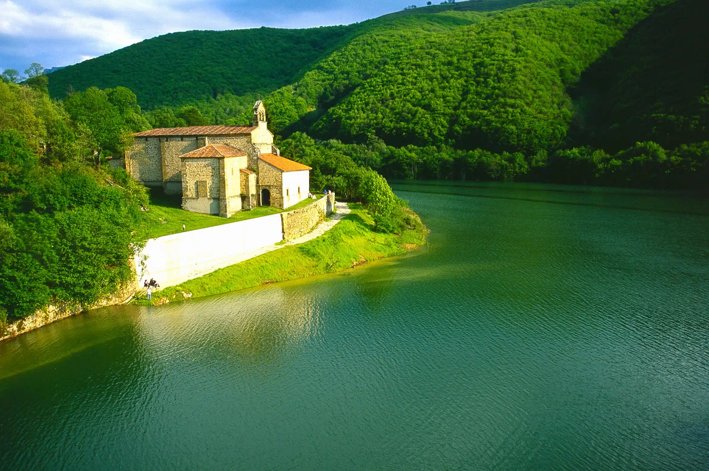 En lo alto de un cerro a poco más de tres kilómetros de Pola de Lena y en medio de un paraje de praderías desde el que se domina el valle, impacta la imagen de esta iglesia prerrománica…